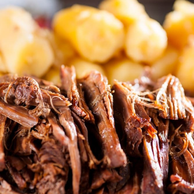 Combo 2kg = 500 g de costela no bafo, 500 g de mandioca cozida ou frita, 400 g de arroz, 400 de feijão cozido, farofa e vinagrete 200g