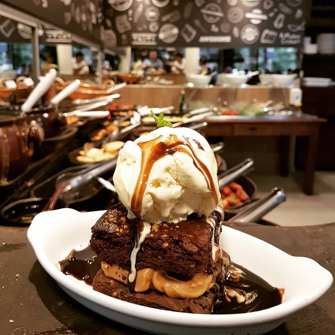 Massa de chocolate com castanhas recheado com doce de leite e servido com sorvete de creme.