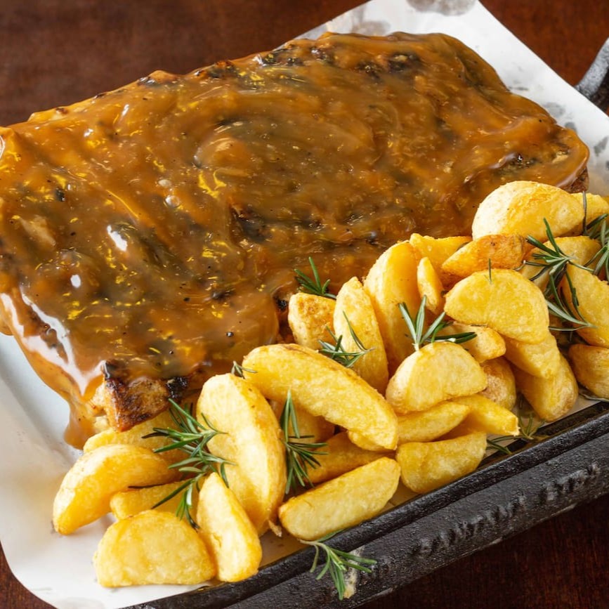 Costelinha suína preparada no processo sous vide, marinada no molho a base de whisky Jack Daniels (900g), servida com batatas rústicas condimentada (400g)+ Farofa e Vinagrete (100g)