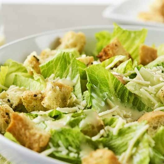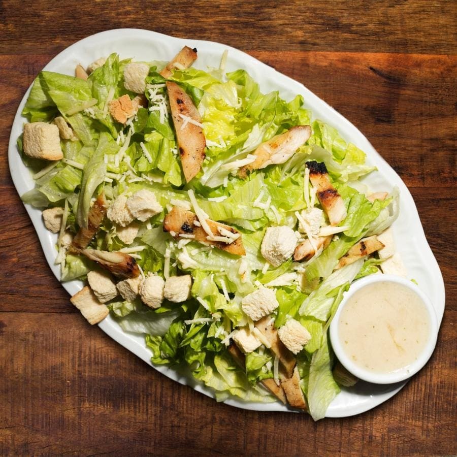 Clássica salada composta de alface americana, croutons, parmesão ralado e frango grelhado em tiras. Acompanha molhos , azeite e vinagre.