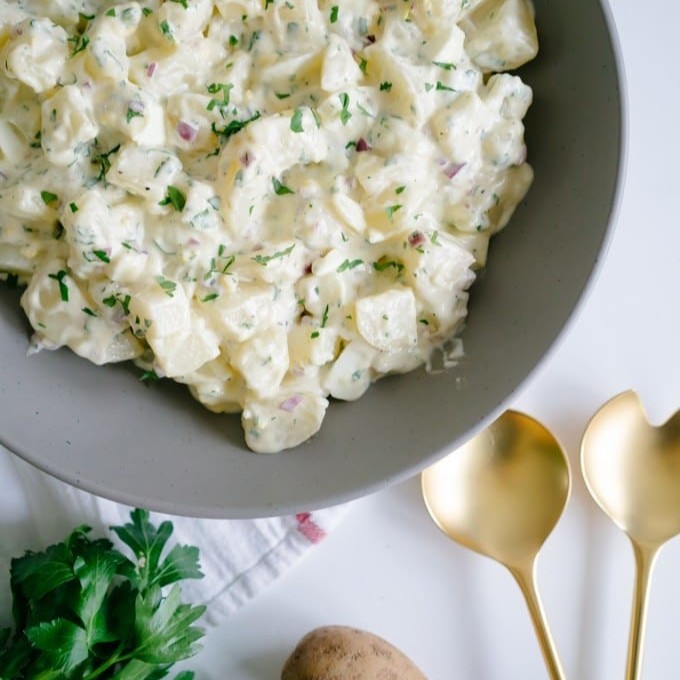 Batata e ovos cozidos com maionese hellmans, salsinha, azeite e cebola picada.