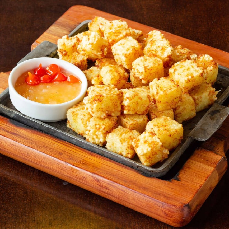 Bolinho de massa de mandioca e recheio de carne seca temperada acompanha molho de Alho (90g)