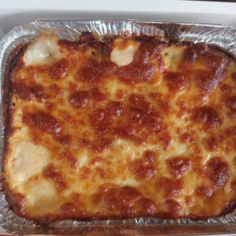 Costela bovina no Bafo com molho Bechamel e cobertura de Queijos (500g). Acompanha arroz branco (250g)