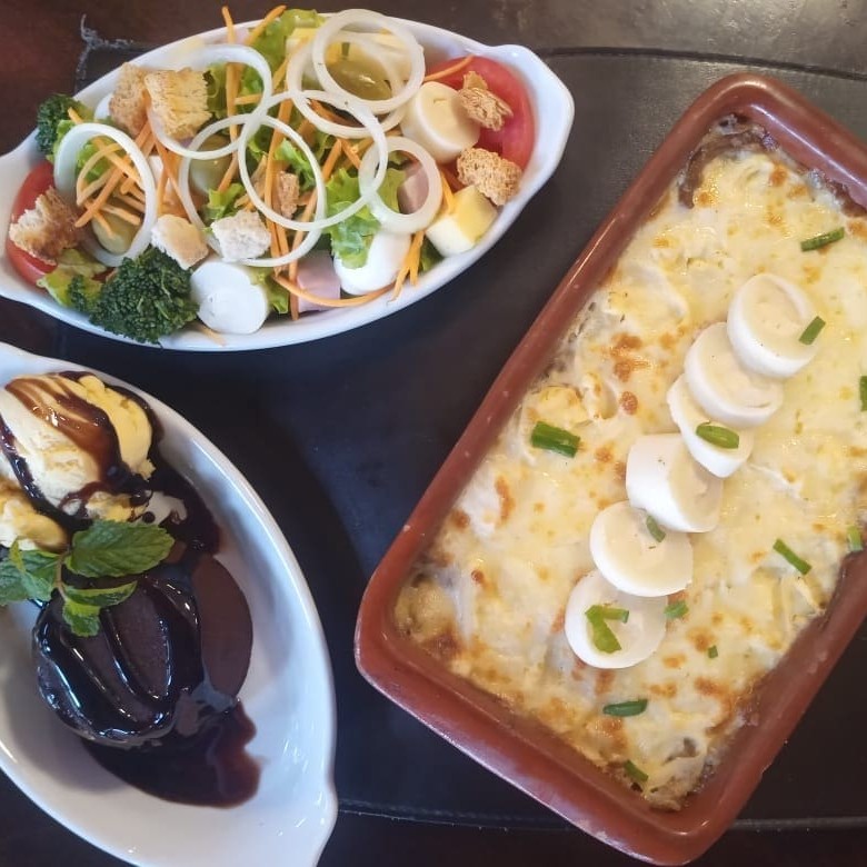 Salada Brasileira pequena + Costela com molho de queijos e palmito + Petit Gateau (02 unidades)