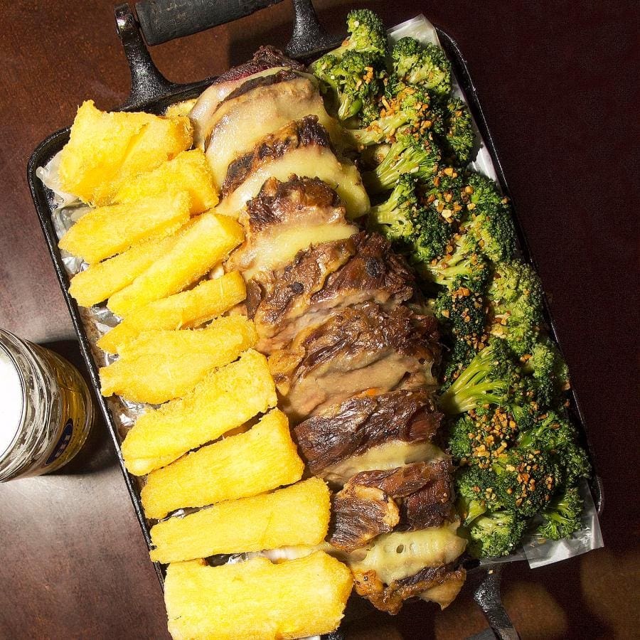 A Original costela preparada no bafo, por 12 horas, recheada com legumes, linguiça calabresa e provolone. (1200g) Acompanha brócolis com alho (200 g), mandioca frita (400g) e farofa e vinagrete (300g)