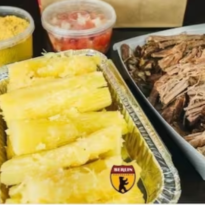500g de costela no bafo desfiada, 500g de mandioca frita ou cozida, farofa, vinagrete e 02 cervejas Original tipo pilsen de 600 ml.