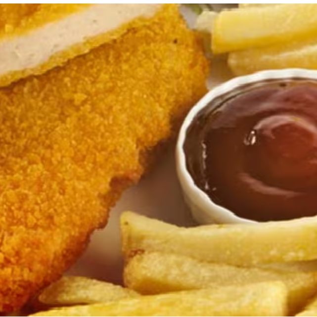 Frango Empanado (150g) com Batata Ondulada (150g) , Arroz Branco (170g), Farofa , vinagrete e molho Barbecue (280 g) Serve 1 pessoa (750g)
