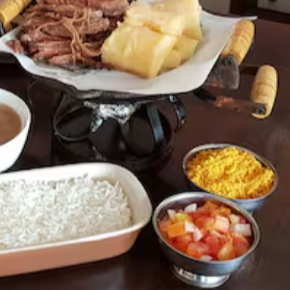 Costela desfiada com requeijão, coberta com purê de mandioca e parmesão gratinado, assada no forno a 200 graus. (400 g). Acompanha arroz branco (300 g).
