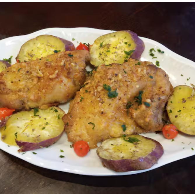Coxa e Sobrecoxa Assada (400g) com Legumes ( Batata Assada com ervas ou Mix de legumes na manteiga (200g)+farofa e vinagrete (100g) Serve 1 pessoa (699g)