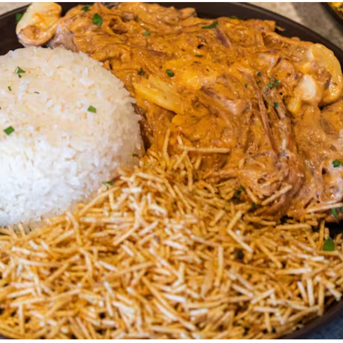 Stronogoff de Costela (300 g) , acompanha arroz branco (250g) e batata palha (50g) Serve 1 pessoa (600g)