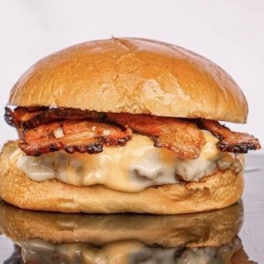 Pão Brioche, carne 140gr artesanal, fatias de bacon defumado, coberto com queijo e molho especial