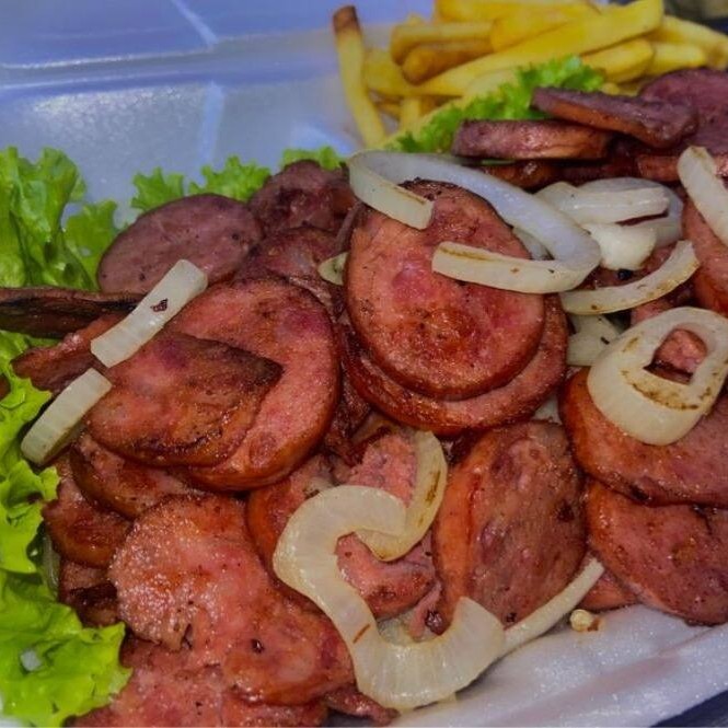 Porção Calabresa Acebola + Batata Frita + Maionese Verde.