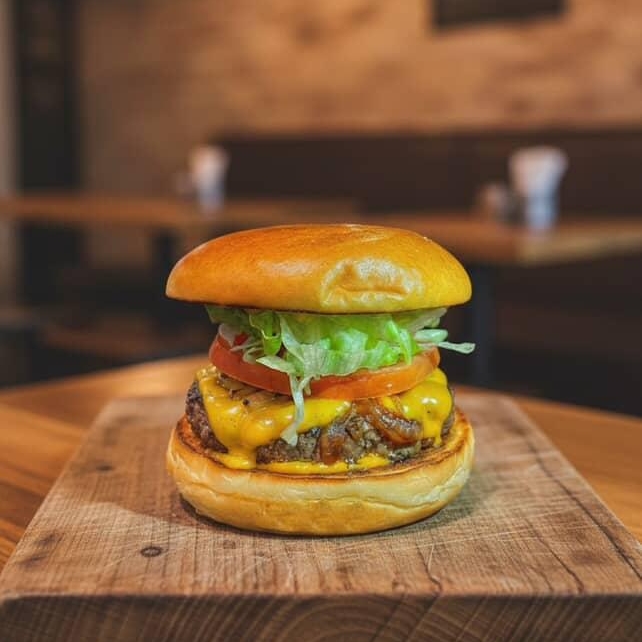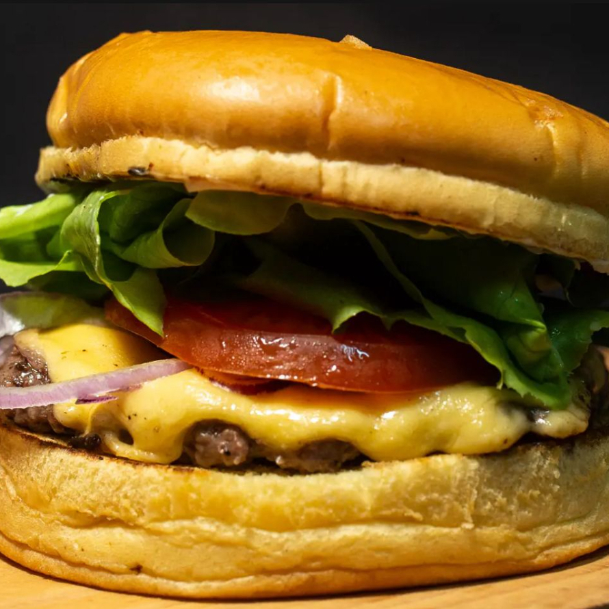 Pão brioche, hambúrguer tradicional, queijo cheddar, alface, tomate, maionese de alho.