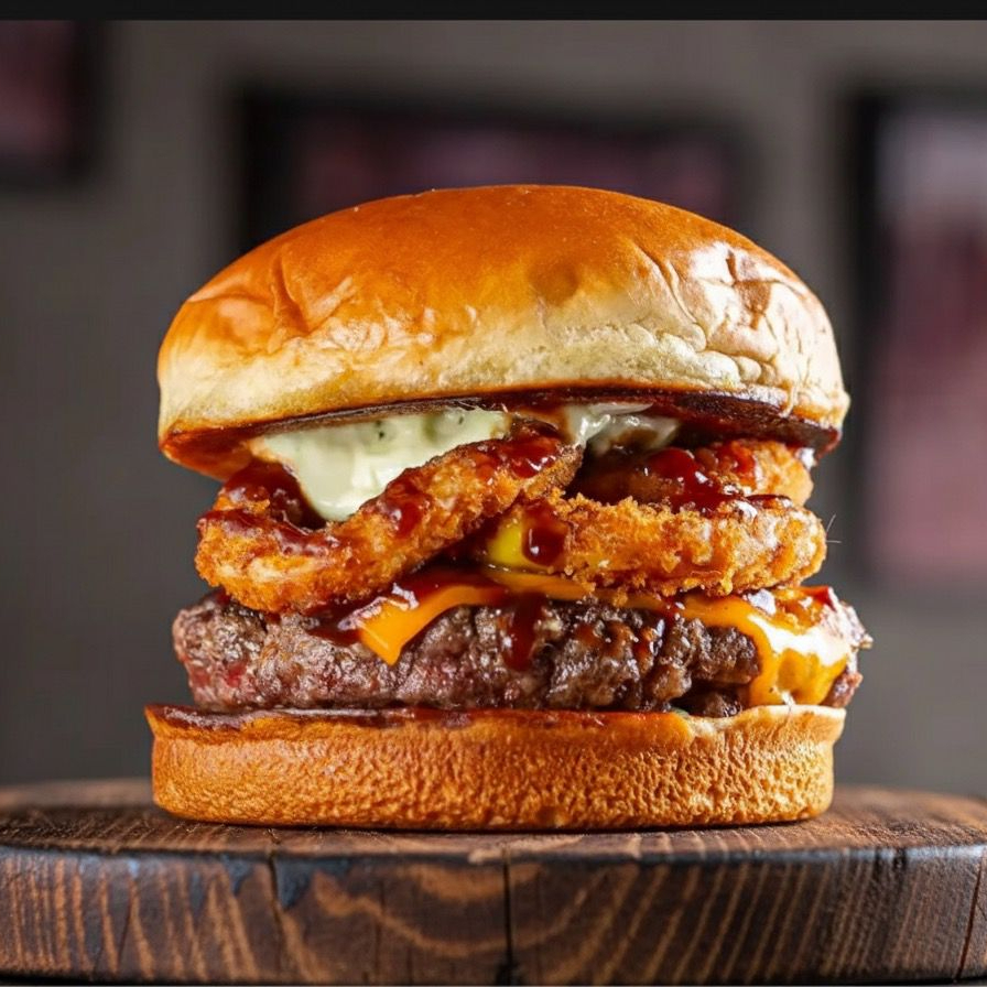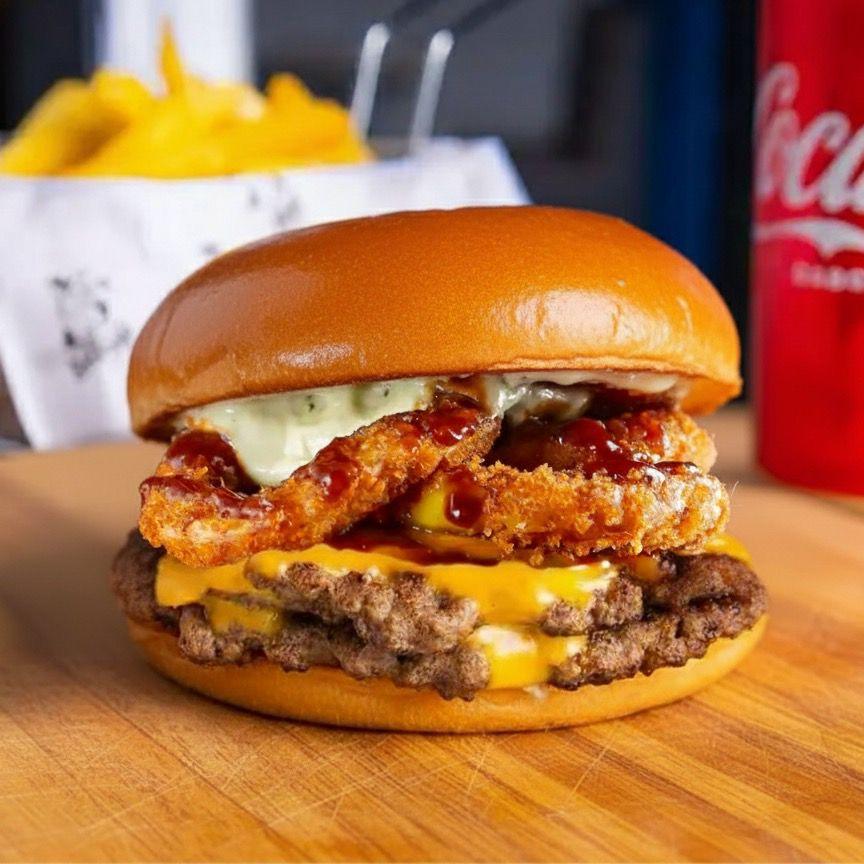 Pão brioche, 2 smash queijo cheddar cremoso, bacon, onion rings e maionese de alho