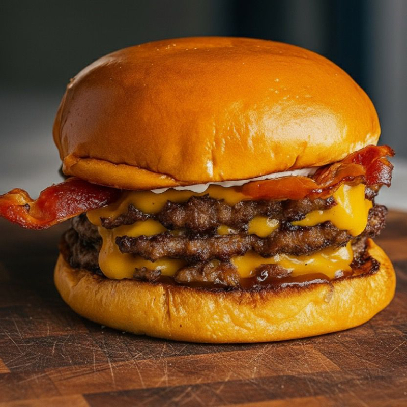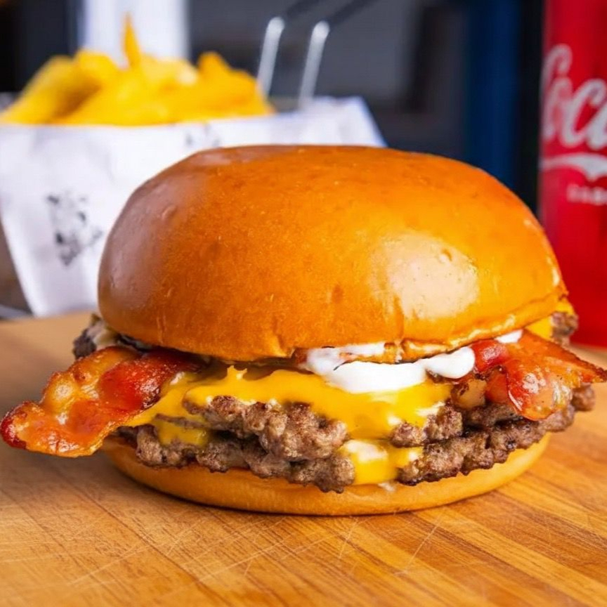 Pão brioche, 2 hambúrguer de 80g, caprichado no cheddar, bacon bem fritinho e crocante, cebola caramelizada artesanal e maionese grill