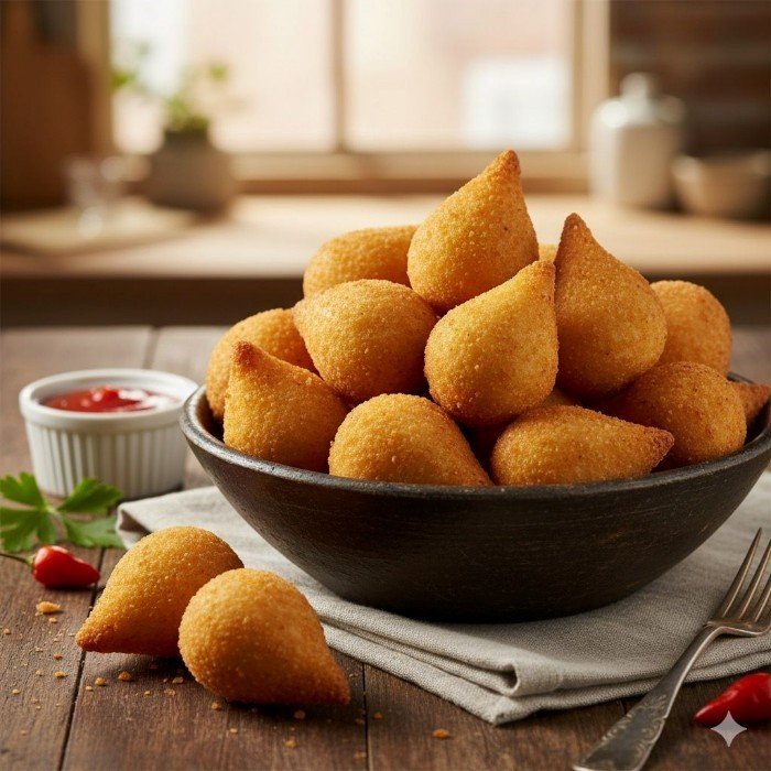 Deliciosa coxinha tradicional feita com massa macia à base de farinha de trigo, cuidadosamente temperada e recheada com frango desfiado e bem temperado. Crocante por fora e irresistivelmente cremosa por dentro, é o salgado perfeito para qualquer momento do dia.