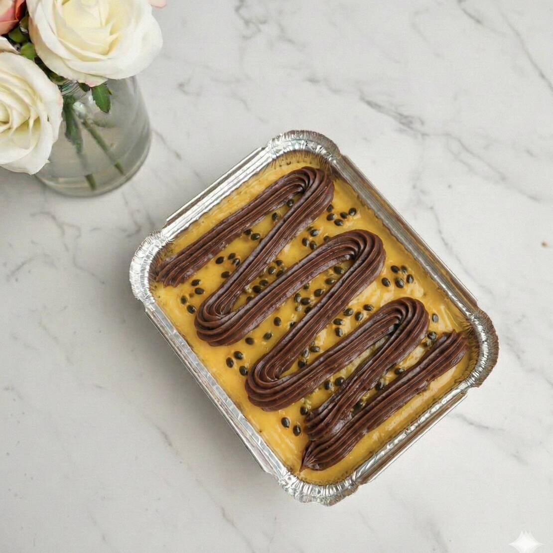 Mini bolo de pote de massa cacau, recheio de creme de maracujá + caramelo de maracujá e nutella. Pote de 150ml
