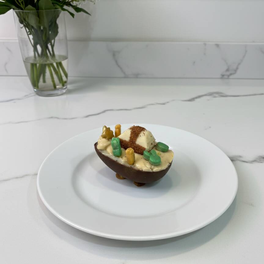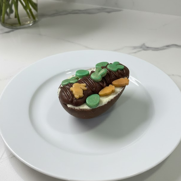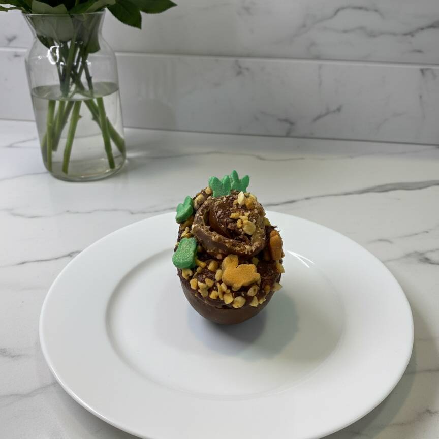 Intenso e crocante: brigadeiro 50%, Nutella, crocante de amendoim e finalizado com meio Ferrero Rocher e enfeites de Páscoa de pasta de Leite Ninho. Tamanho referência 50g