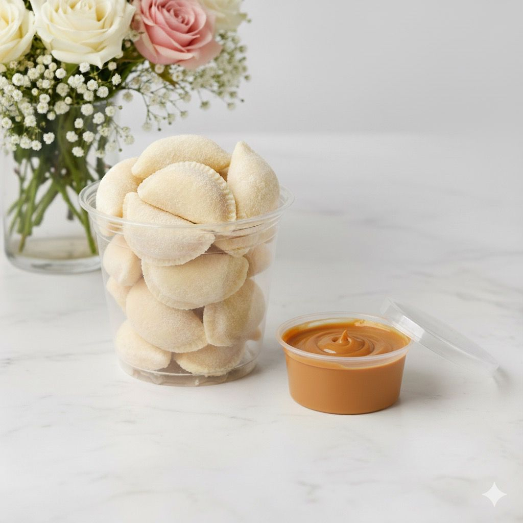 Incriveis mini pasteizinhos (4cm) não frito de leite Ninho (16 unidades) acompanhado de 30ml de creme para chuchar.