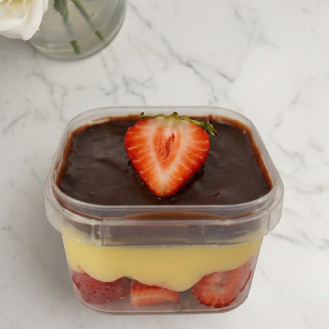O escondidinho de brownie é feito na marmita com cobertura de brigadeiro de ninho, rastros de nutella e muitos morangos picados. Aproximadamente 200g
