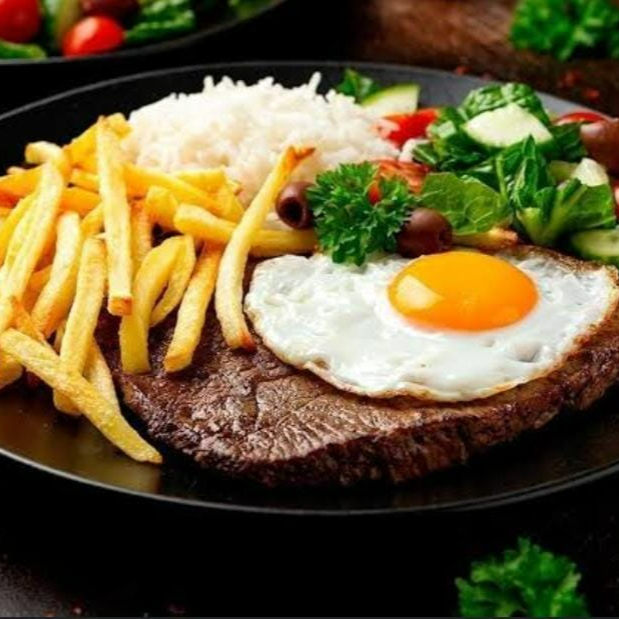 Delicioso bife de contra filé, acompanhado de arroz fresquinho, feijão, batata fritas e uma deliciosa salada