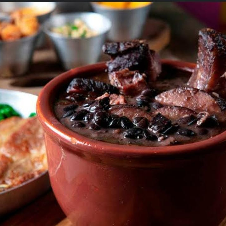 arroz , feijoada , bisteca , couve , torresmo , farofa e banana a milanesa
