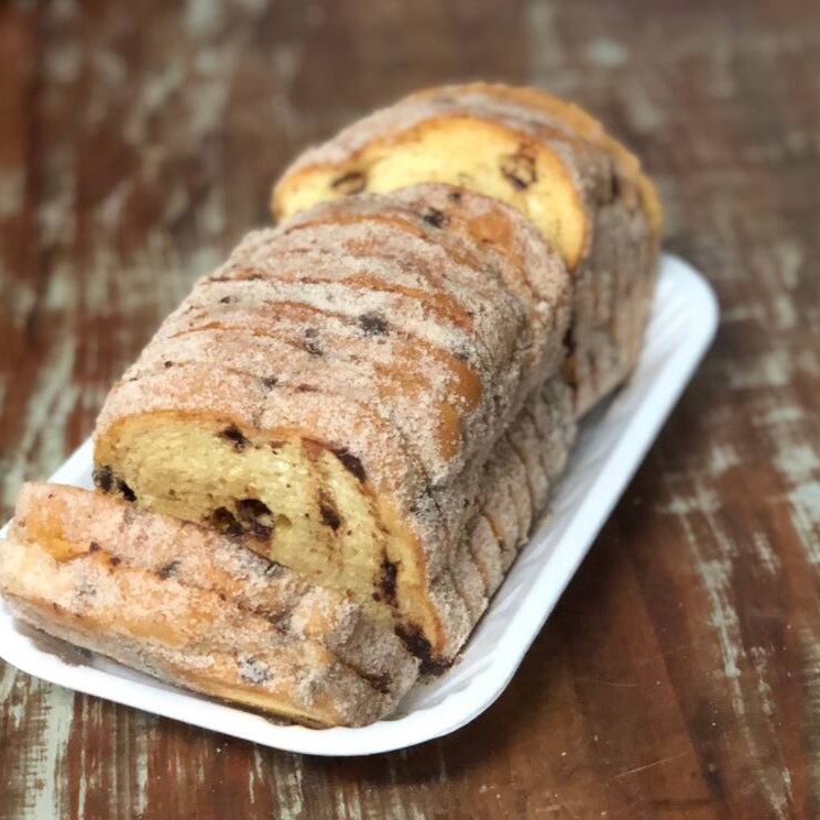 Mesma massa do panettone tradicional, com gotas de chocolate ou frutas cristalizadas, e açúcar e canela por fora. Aprox. 500g