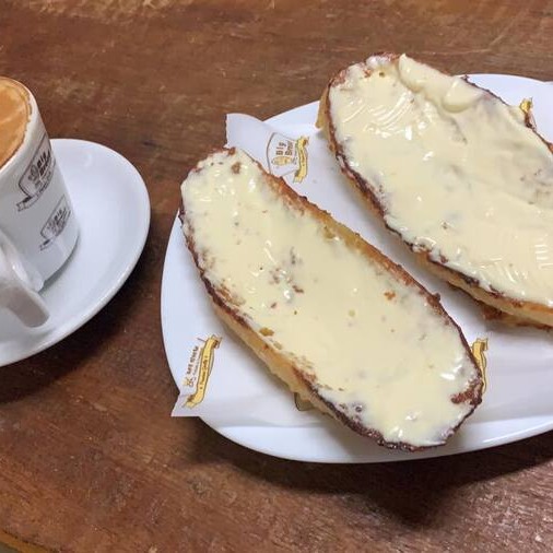 1 média de cafe com leite, baguete de parmesão com manteiga na chapa, saida requeijao