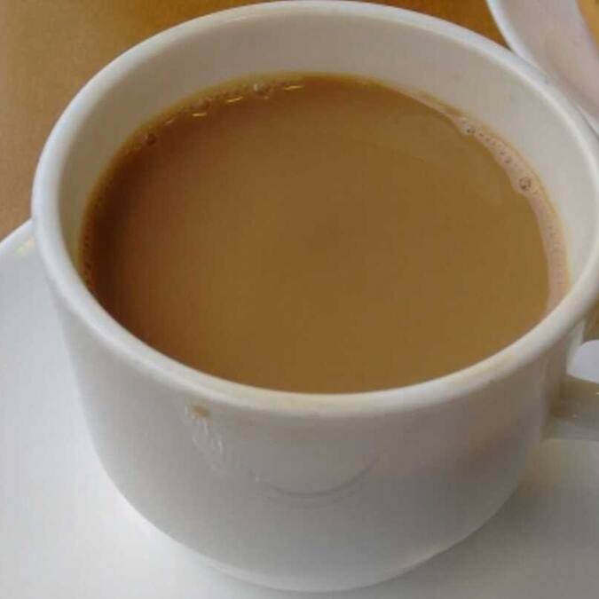 Café com leite médio. Aprox 100ml em embalagem para viagem.
