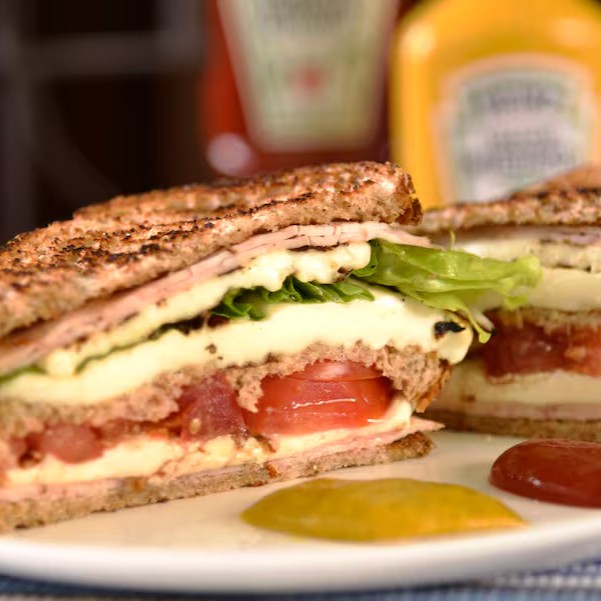 Pao sirio medio, presunto, queijo, ovo, bacon, tomate, alface e maionese