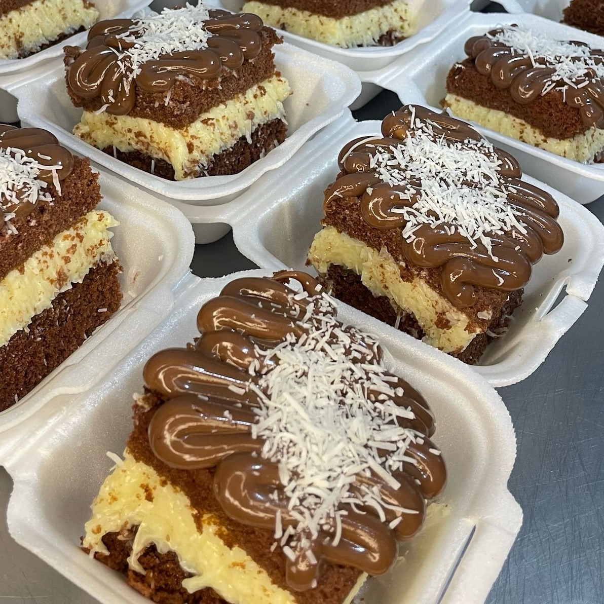 Deliciosa massa de chocolate caseira , recheio de Prestígio, cobertura de ganache ao leite e côco ralado.