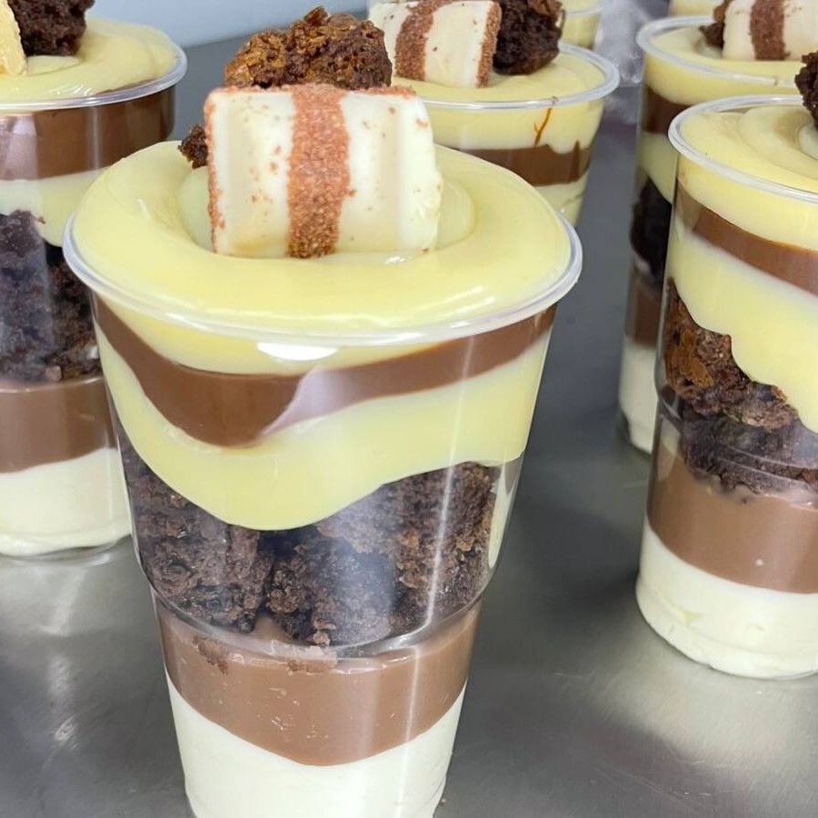 Copo composto por delicioso mousse de maracujá da fruta , pedacinhos de Brownie e brigadeiro cremoso.