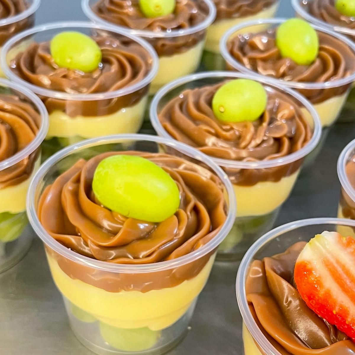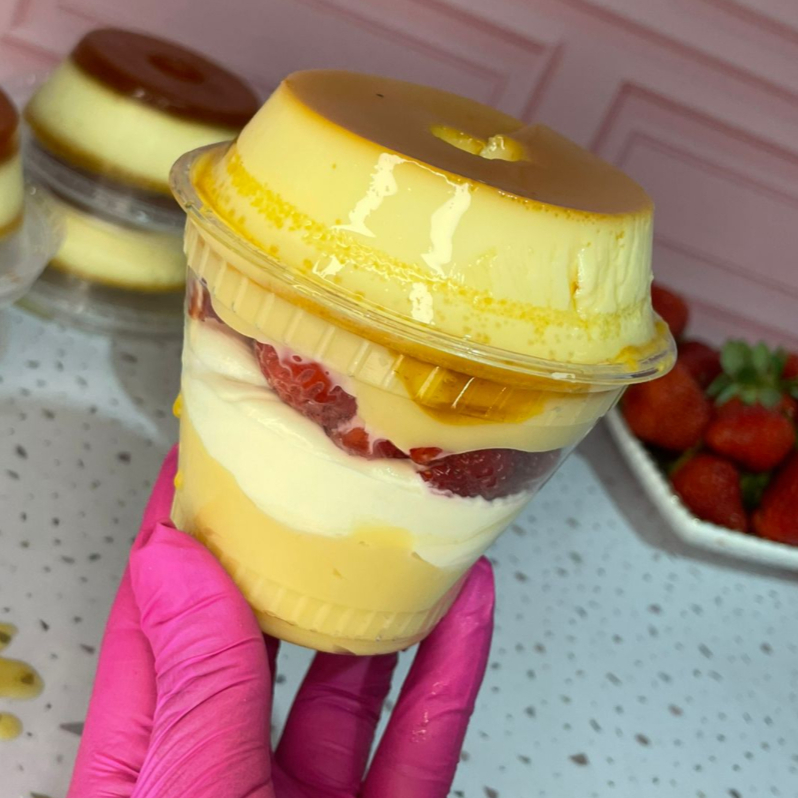Copo composto por brigadeiro de ninho,creme de ninho, morango fresco picado e pudim de leite condensado