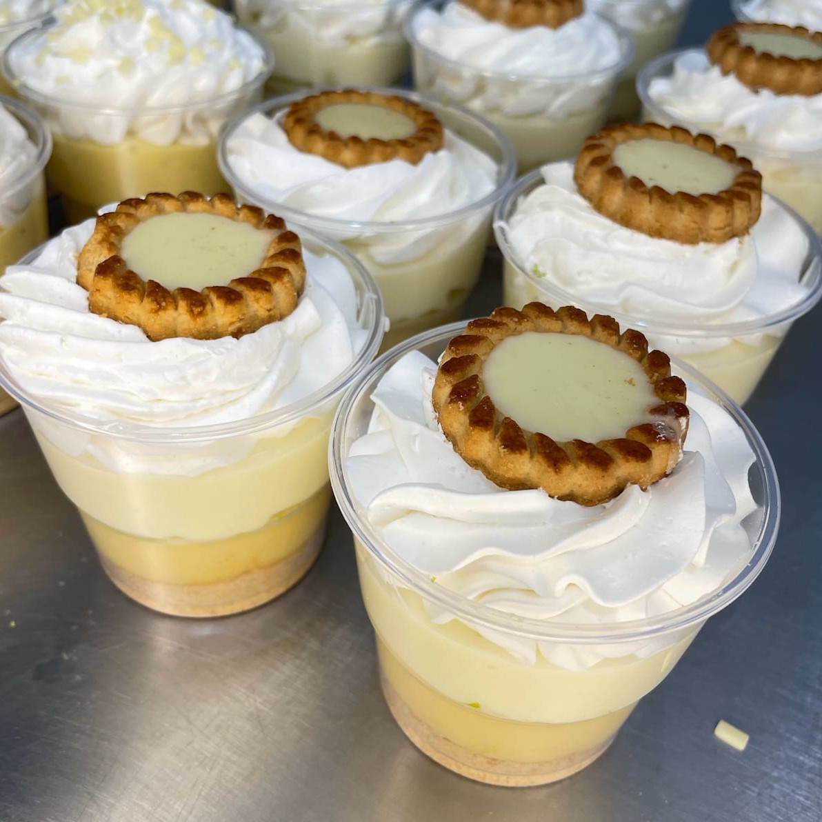 Massa de bolacha triturada, brigadeiro branco com raspas de limão, mousse de limão finalizado com chantilly