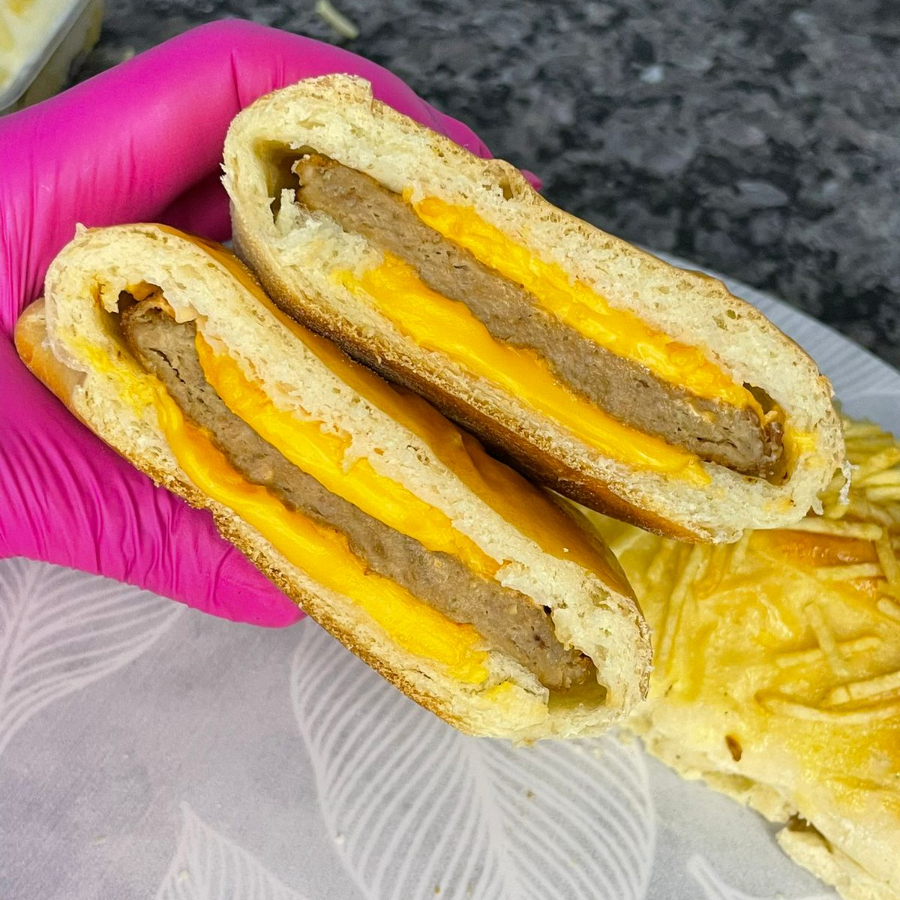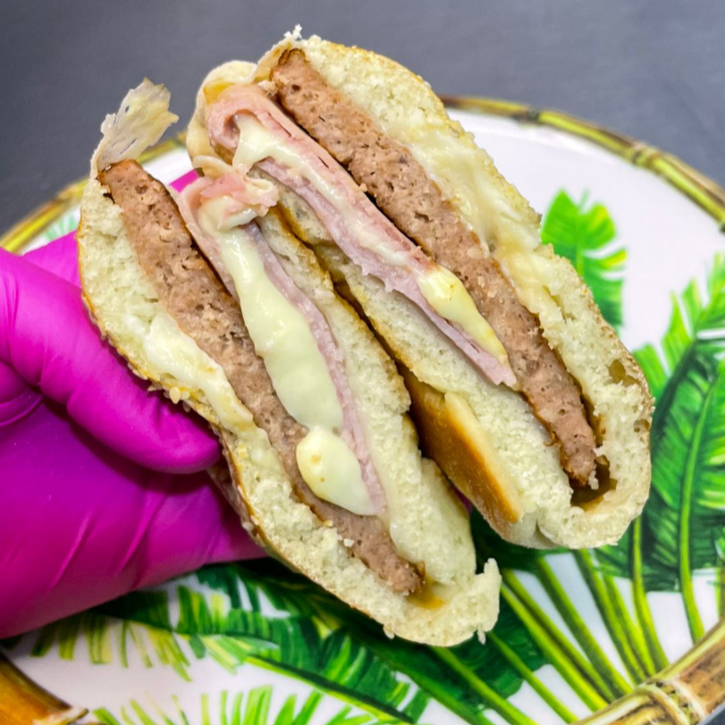 Recheado com catupiry original , hamburguer , presunto e queijo.