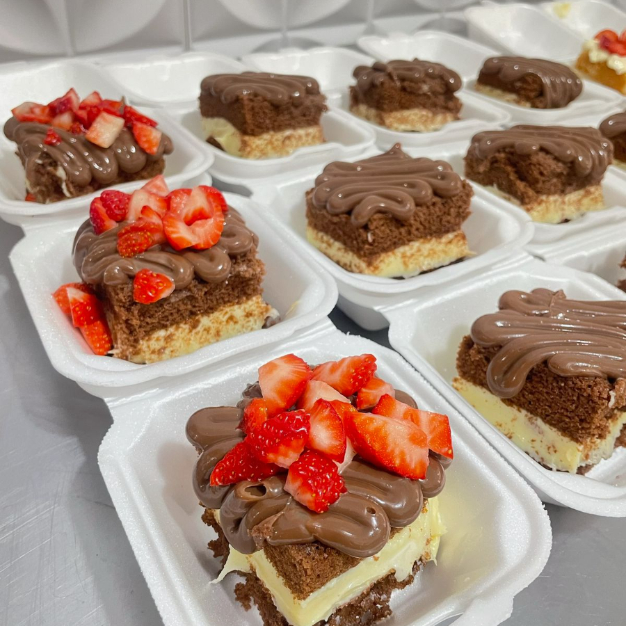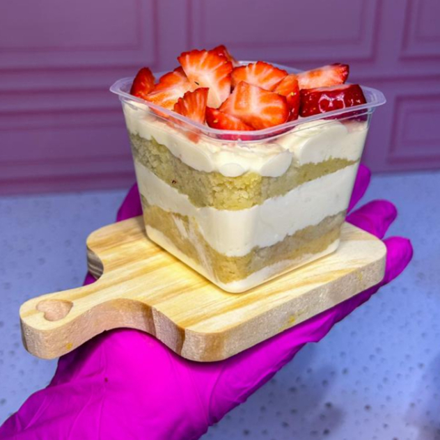 Massa caseira e fofinha de baunilha, intercalada com nosso delicioso mousse de Ninho e morango picado por cima