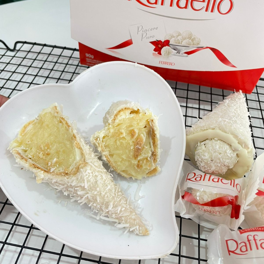 Casquinha de sorvete banhada no chocolate branco, recheado com cremoso de côco