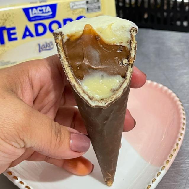 Casquinha banhada com chocolate ao leite, recheio brigadeiro de Ninho com Nutella Original.