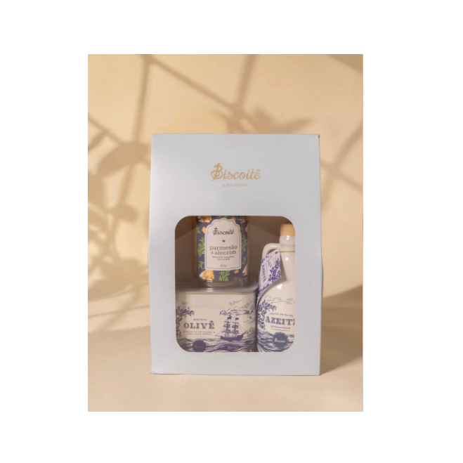 Sabor que transforma qualquer refeição em ritual. Com olivê, azeitê e parmesão com alecrim, esse kit é um presente para quem ama cuidar dos detalhes. Contém 1 sacola como visor azul sortido + 1 azeite + 1 lata olivê + 1 parmesão com alecrim ou cebola crispy
