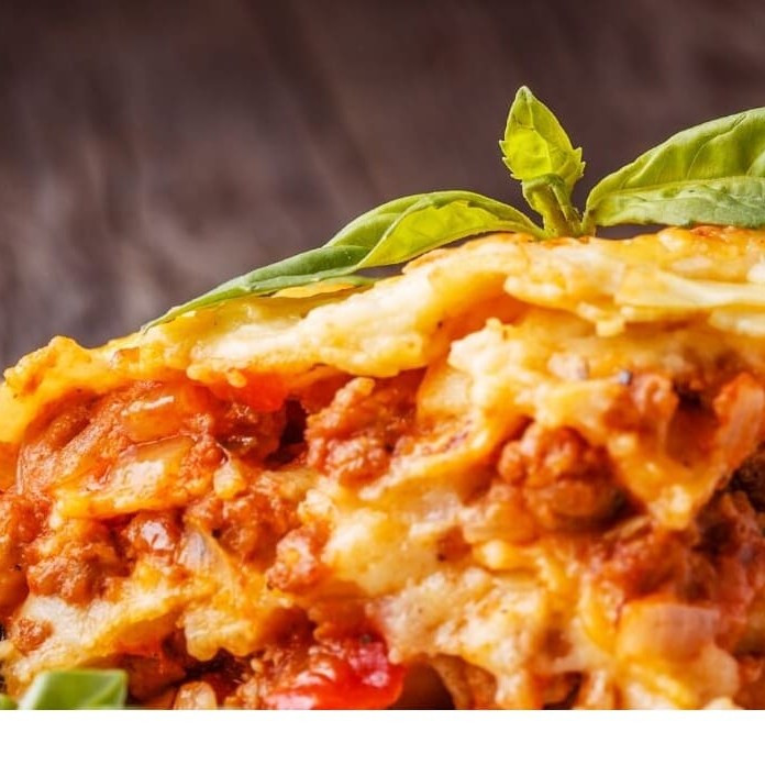 Deliciosas camadas de beringelas a milanesas, queijo e presunto com molho de tomate. Acompanha salada