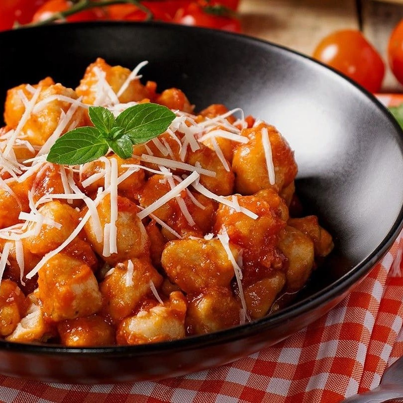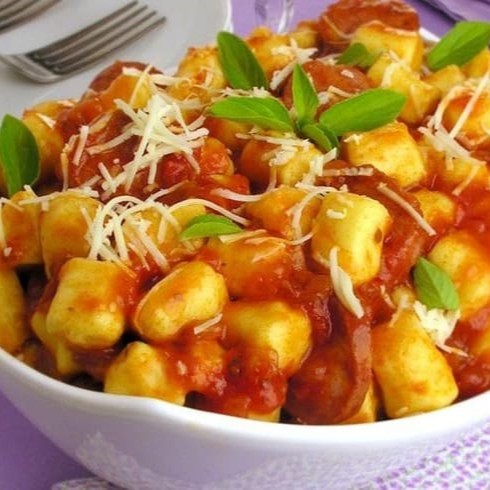 Delicioso nhoque de mandioquinha com molho de tomate.