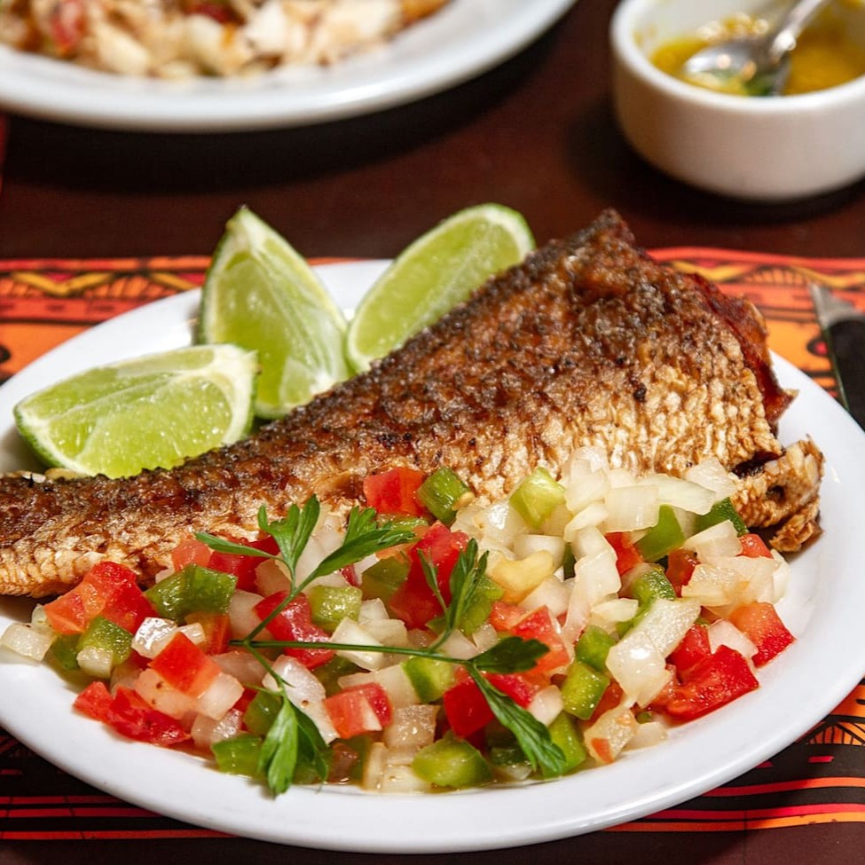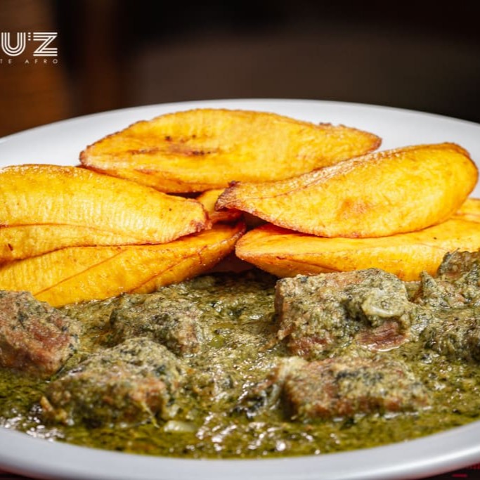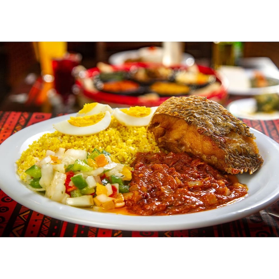 Folha de mandioca, fufu de milho com peixe frito* manioc miled leaf, corn polenta and firied fish.