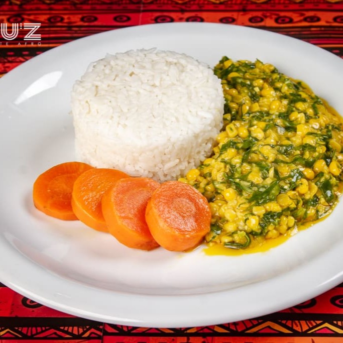 Milho refogado com azeite de dendê e couve, arroz e cenouras cozidas. Stewed corn with palm oil and cabbage with rive and coocked carrots