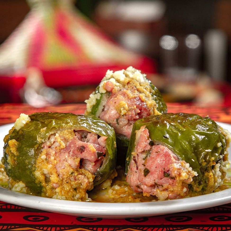 Jilós recheados com linguiça e carne desfiada acompanha molho verde e farofa de attieke.