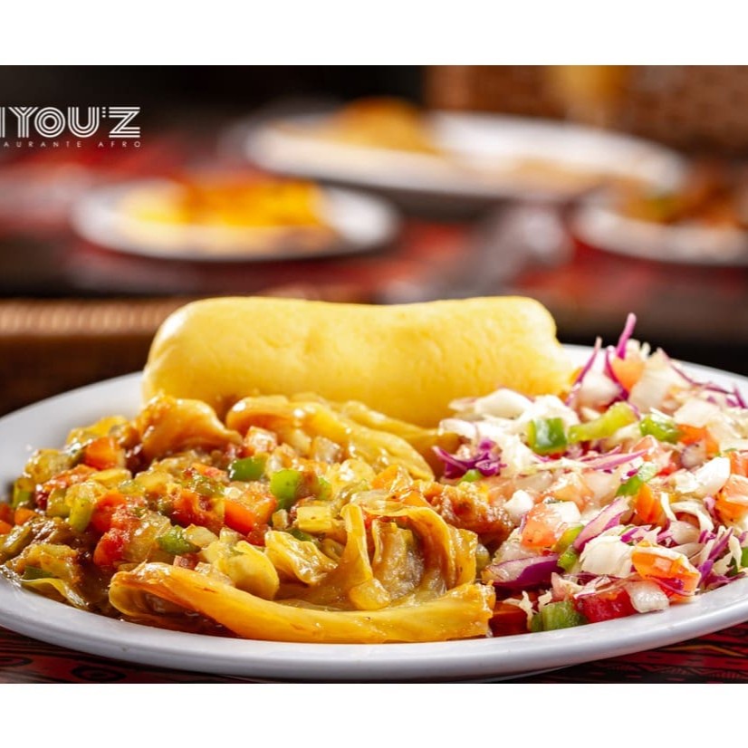 Repolho refogado com tomate, fufu de milho e salada steamed cabbage with tomato, corn polenta and salad