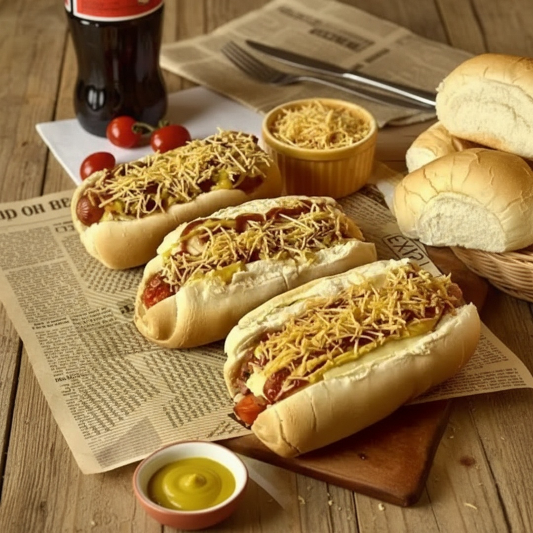 PÃO,SALSICHA,MOLHO DE TOMATE,MOSTARDA,VINAGRETE,MILHO,PURE DE BATATA E BATATA PALHA