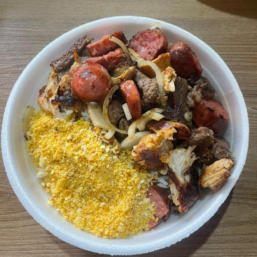 Mista de carnes,Contra File, Frango e Linguiça, acompanhado por arroz, feijão e farofa artesanal.