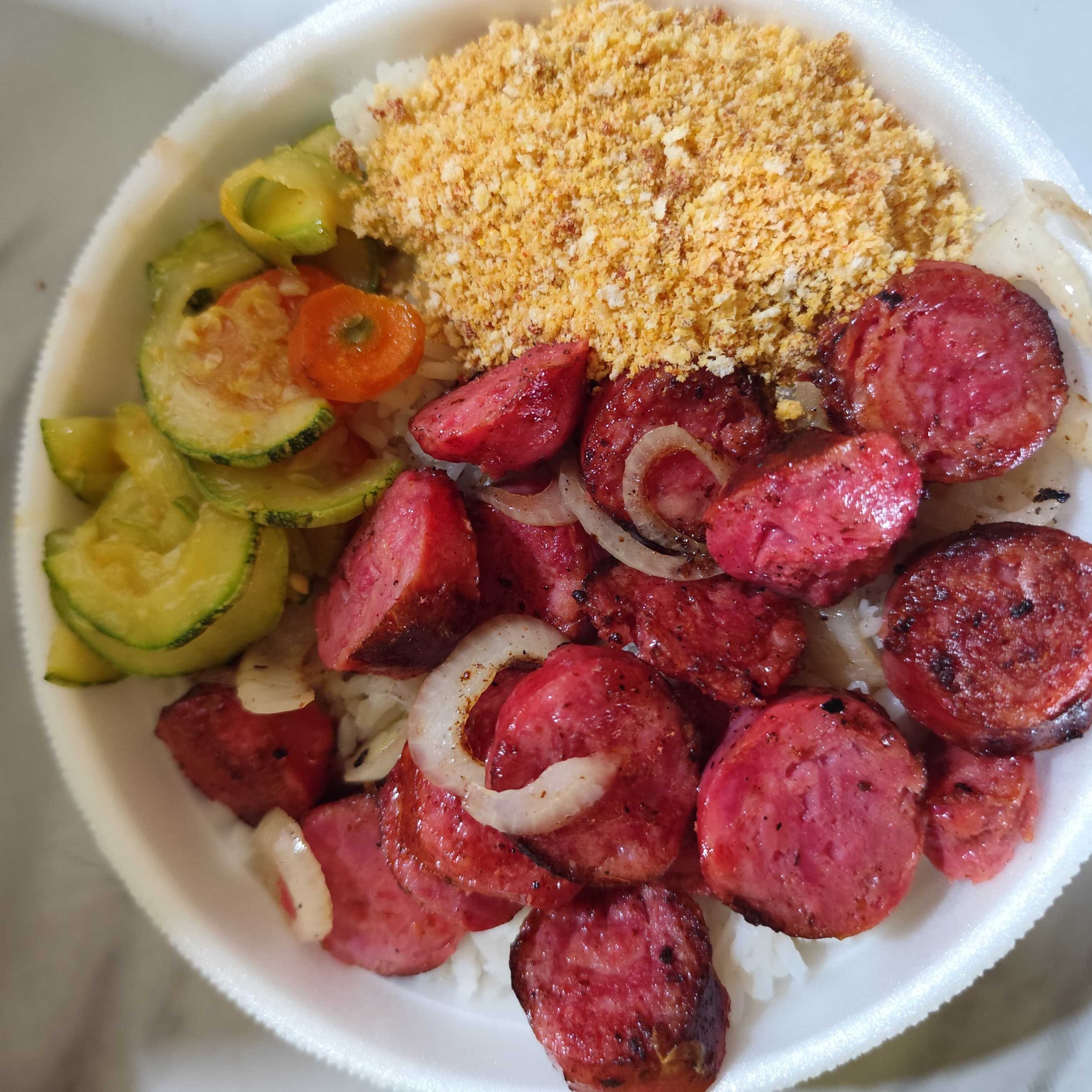 Linguiça Calabresa grelhada, acompanhada de farofa, arroz, feijão e salada.