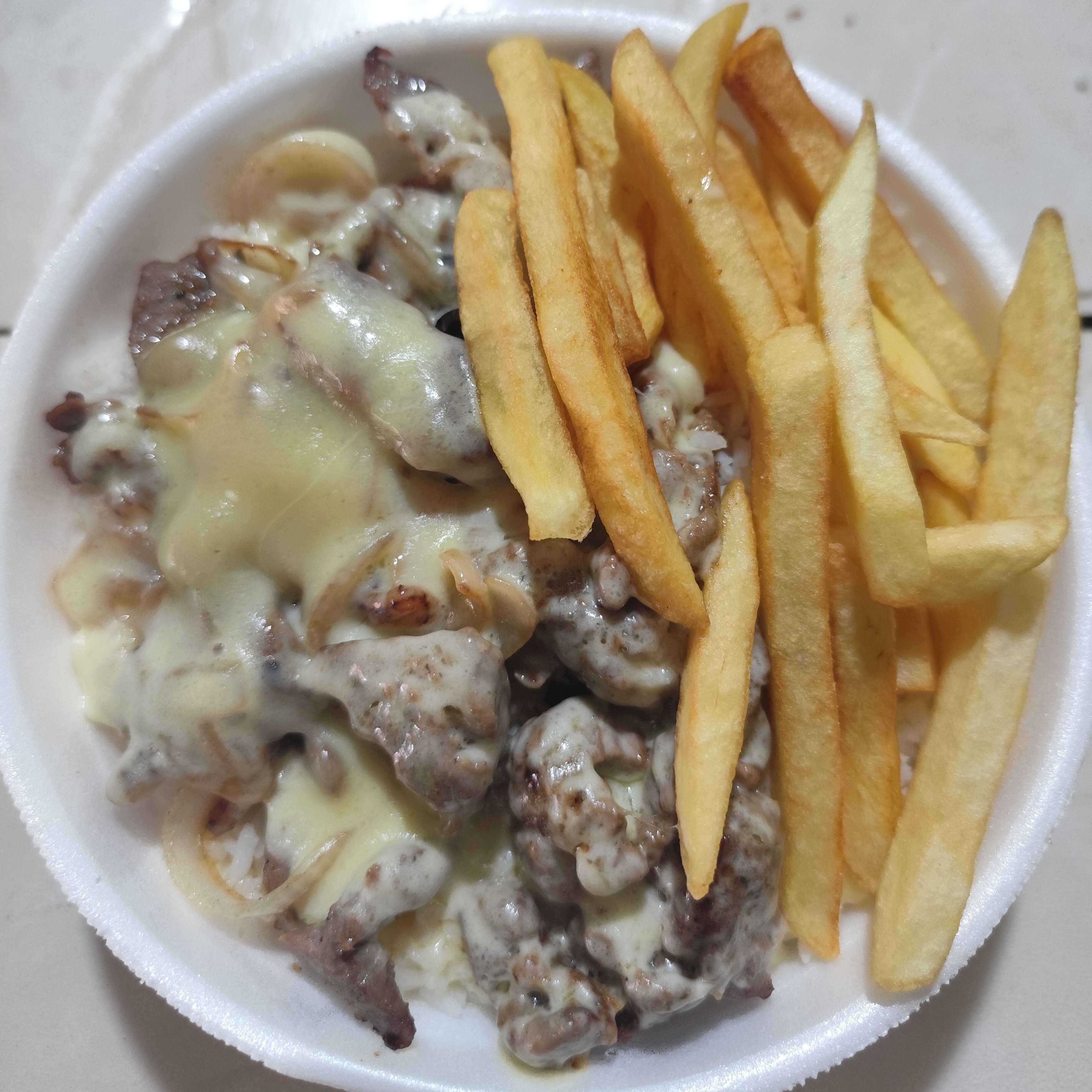 Contra Filé Com Queijo e Fritas, arroz , feijão e salada