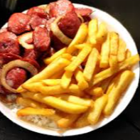 Linguiça artesanal grelhada, acompanhado de fritas, arroz, feijão e salada.